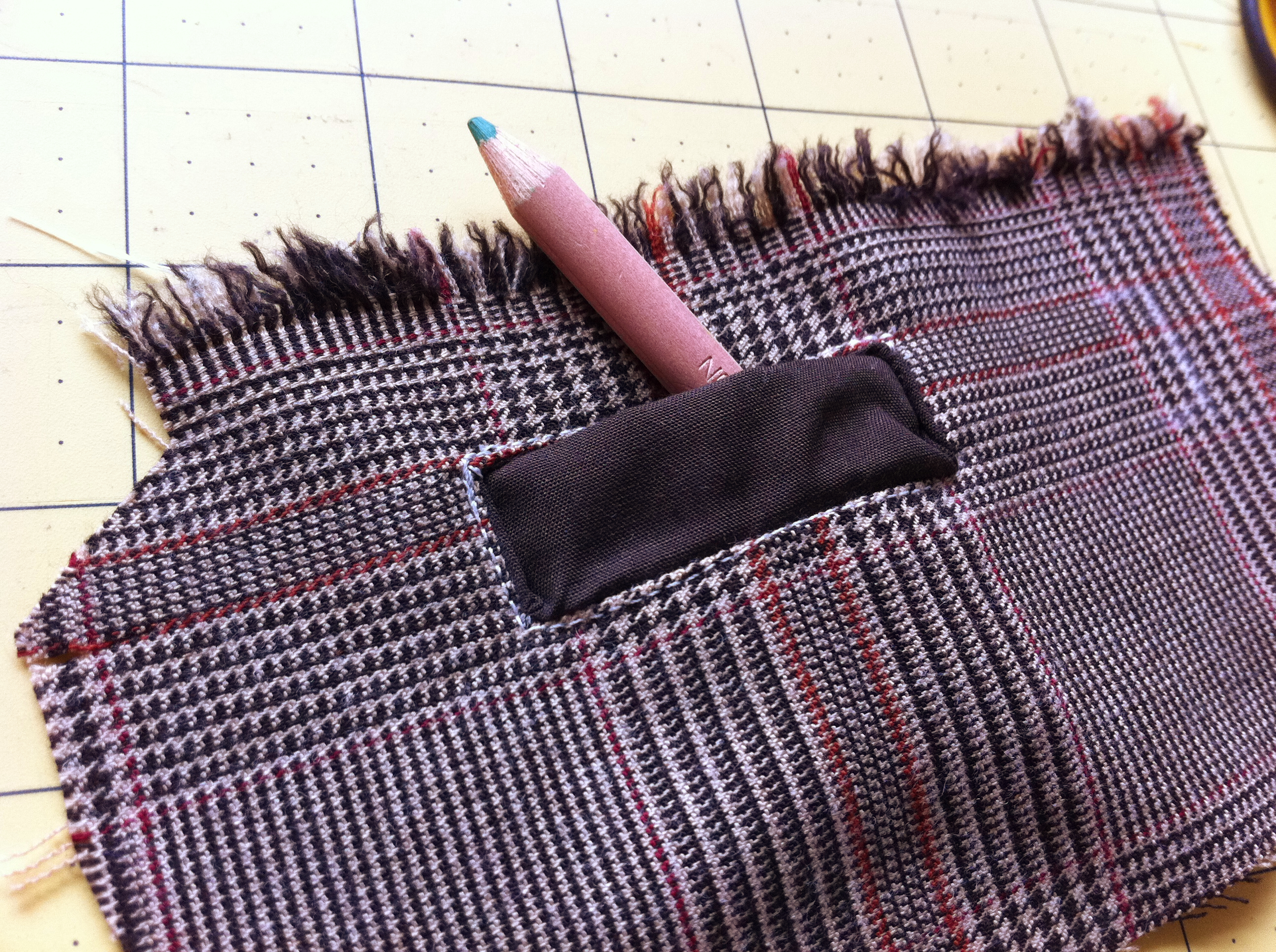 I’ll leave you with something new I learned today. A single welt pocket! Here’s the tutorial from ikat bag. And here’s my mini practice pocket that I made with scrap fabric. What could this be for?? 🙂