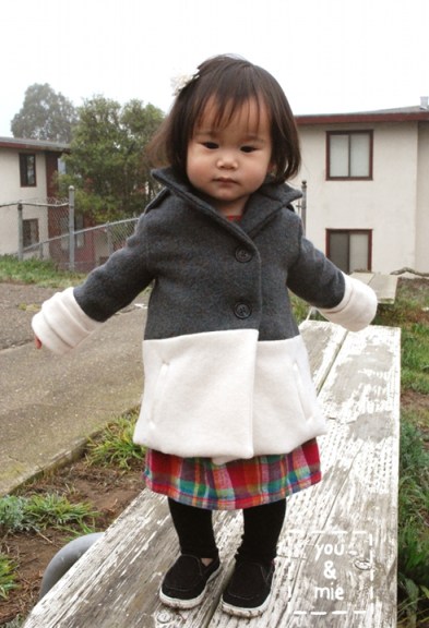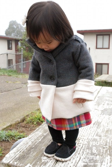 I searched for coat inspiration and pinned a bunch of stuff. One idea that stood out to me was a two tone, or color blocked coat, like this:
