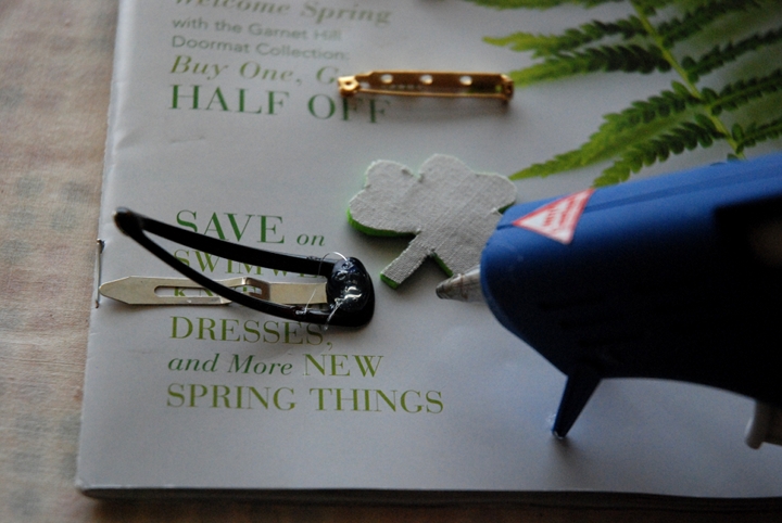 Then just heat up the glue gun and apply a generous amount of glue to the pin back and/or hair clip and attach the sticker.