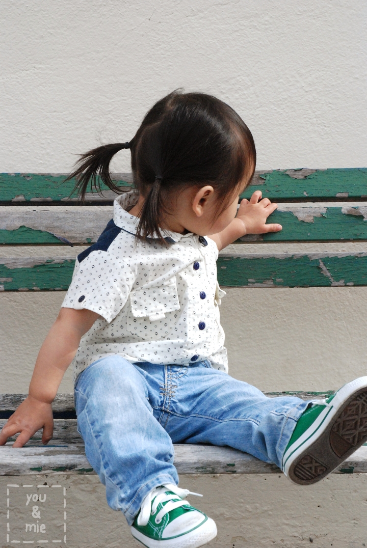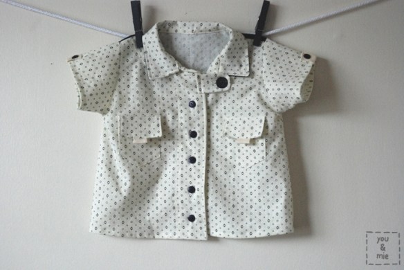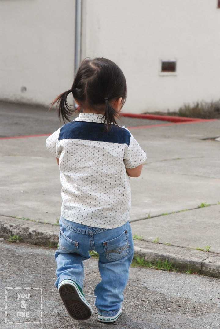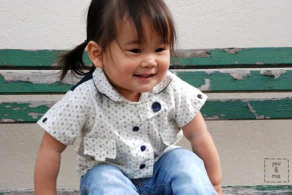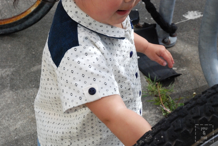 I debated whether I should make the top a little more feminine by picking more “girly” fabrics, but decided to go with something simple and (in my opinion) gender neutral.  I knew Yuki could pull it off.  The fabric reminds me of a Japanese shirt, though I don’t actually know if the fabric is Japanese.  I love the finished shirt and all the cute details.