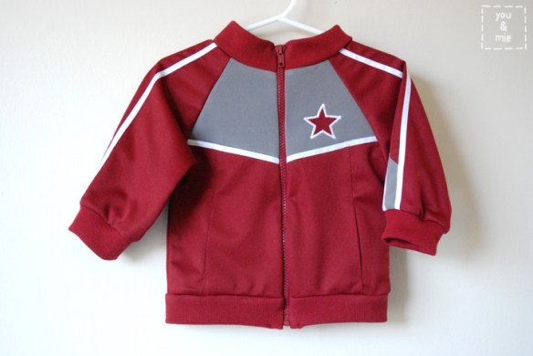 So when I thought the theme was athletic wear, I had no problem thinking of what I wanted to make. We’d been looking for a track jacket for Yuki for some time, but it was hard to find one that was cute and affordable. I knew it would be challenging to make, but I thought I’d give it a try. I was inspired by vintage tracksuits in color, material (100% polyester baby!) and style, but added my own little touches here and there. It certainly isn’t an original idea, by any means, but we’re excited because it’s something we’ve been looking for and we knew she’d love wearing it! So without further ado, here’s my Vintage All-Star Tracksuit!