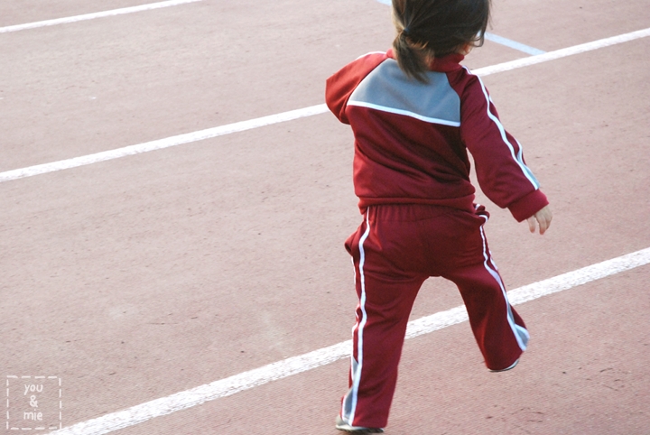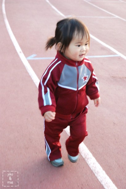 Absolutely adorable!! The track suit looks amazing. And the photos are a riot! I love the action shot of her running!