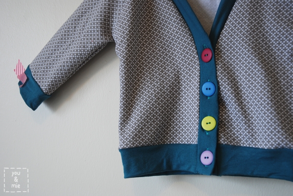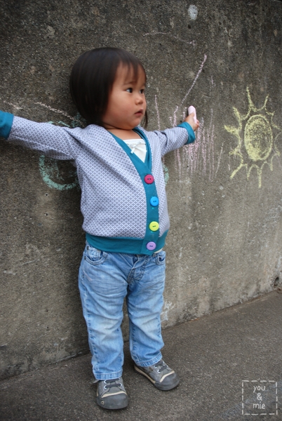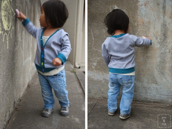 The pattern is great.  It is well written and the diagrams are clear.  Overall the cardigan is pretty simple to construct and sews up super quick.  The size is worked out well for Yuki – I made hers in size 2 and I can tell it’ll fit her for awhile.  The only adjustment that I made was to shorten the sleeves.  I love that it is a basic pattern with lots of room for remixing.  And I LOVE a good unisex pattern too 🙂  I highly recommend this pattern for your library.  It’s a great go-to pattern and I will definitely be making up a few more of these.  You can find it here.