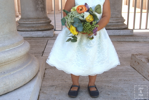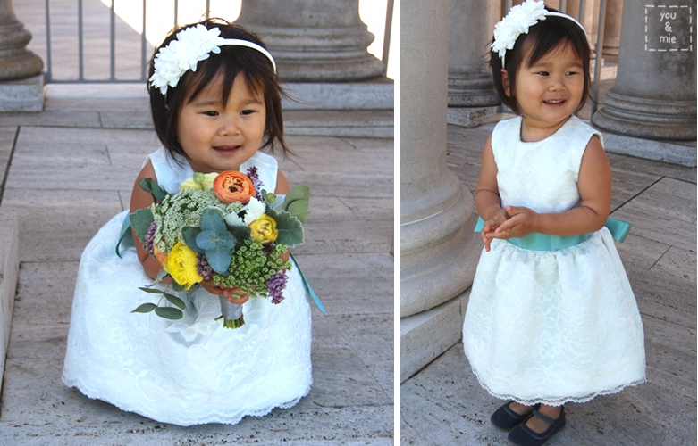 The flowers in these pics are not her actual bouquet from the wedding, but rather those from a table at the wedding. The flowers for the wedding were done by my sister’s friend, Jaclyn K. Nesbitt Designs, and they were all soooo gorgeous! I wrapped these up in some ribbon so Yuki could have another bouquet. I think the flowers were the most exciting part of the flower girl job for Yuki!