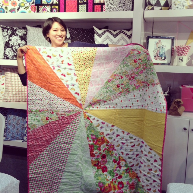 One of the biggest surprises and highlights of Quilt Market for me was visiting the Dear Stella booth and seeing my Sunburst Picnic Blanket there!  They had sewn up the picnic blanket in their Clementine line of fabric, but I had no idea that the blanket would be there at Quilt Market!  It was so exciting to see something that I helped create on display!!  It was such an amazing feeling!