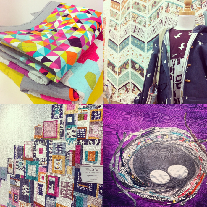 photo 32Beautiful quilts.  Clockwise from upper left: Pure Elements, Birch Fabrics, The Nest Quilt by Carrie of SUCH Designs, and Waterfall with Lotta Jandsdotter’s Glimma Line