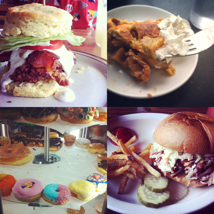 FOOD!  Oh I had some good food.  Clockwise from the upper left: Pine State Biscuits, Random Order Coffeehouse & Bakery, Pulled Pork Sandwich but I can’t remember where it’s from (help me out Kristin!), Voodoo Doughnut!!