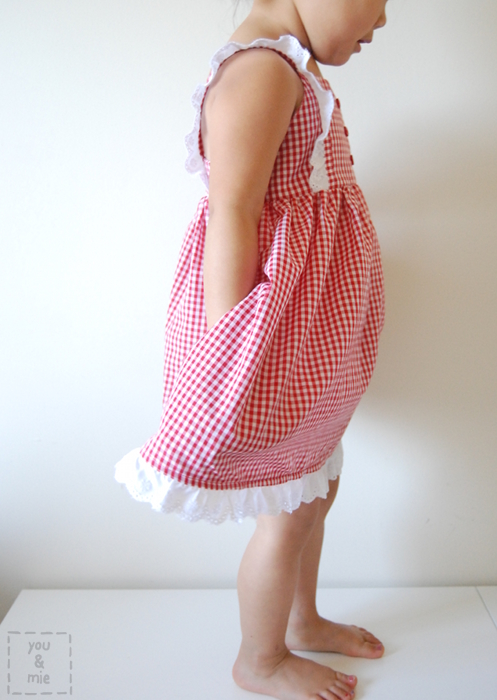 Pockets are kind of a must for me/my kid. I’m not exactly sure what happened (I made this dress a year ago, so all the details are a bit fuzzy), but when I gathered the skirt and attached it to the bodice, the side seams of the skirt (along with the pockets) ended up closer to the back than the front. I’m thinking that the front bodice piece is actually wider than the back, but I’m not entirely sure. Anyways, the pockets are a little far back, but it’s nothing that my kid notices or minds.