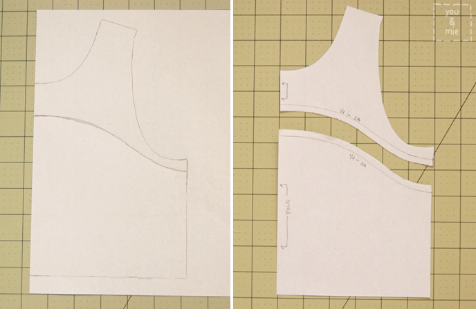 The first step is to color block your front bodice piece.  Print out your front bodice pattern piece and draw a curved line where you want the two fabrics to meet.  Keep in mind that there is a 1 cm seam allowance at the neck and armholes to attach the bands.  Cut your pattern pieces, then trace them and add seam allowance along the curved line.  I added a 1/4 inch seam allowance here.
