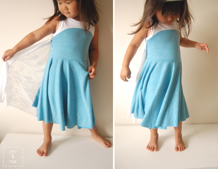 Needless to say, Yuki is pretty pleased with it.  And I’m glad that she didn’t have to walk around in that sweltering heat wearing one of those store bought long sleeved synthetic dresses all day!  Not that there is anything wrong with the store bought dresses, but I just know that if my kid was wearing one of those, she would be so whiny and grumpy all day, but also refuse to take it off.  The dress I made was “Elsa” enough to satisfy my own princess, but keep her comfy and cool.  It’s also casual enough that I let her wear it around now, including to school.  She’s pretty thrilled about that.
