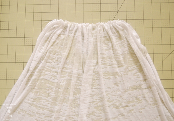 I always use Dana’s Circle Skirt tutorial whenever I make one, except I did not add 2 inches to the waist measurement to come up with the circumference.  I just measured the bodice width and doubled that for the “waist” measurement.  I didn’t add the extra inches because I didn’t want the waist to be any bigger than the bottom of the bodice.  I figured that if it was too small, I could always trim some away from the waist to make it bigger, BUT it ended up fitting perfectly!