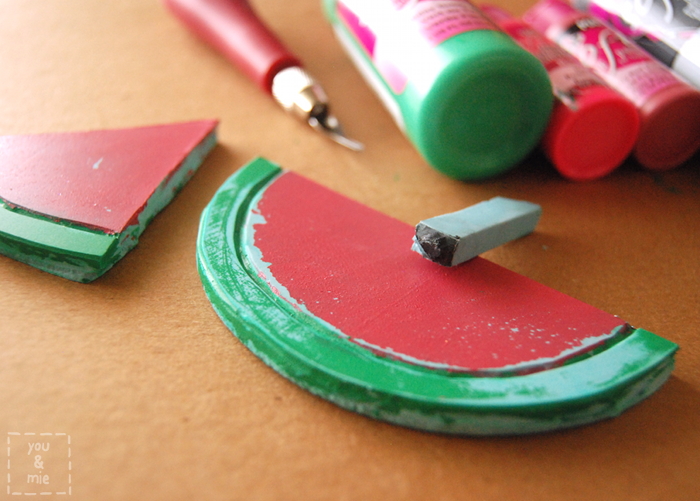 I carved two watermelon shapes, one half circle and one slice.  I carved away a line to separate the rind from the fruit.  Probably the most simple stamps I’ve ever made!