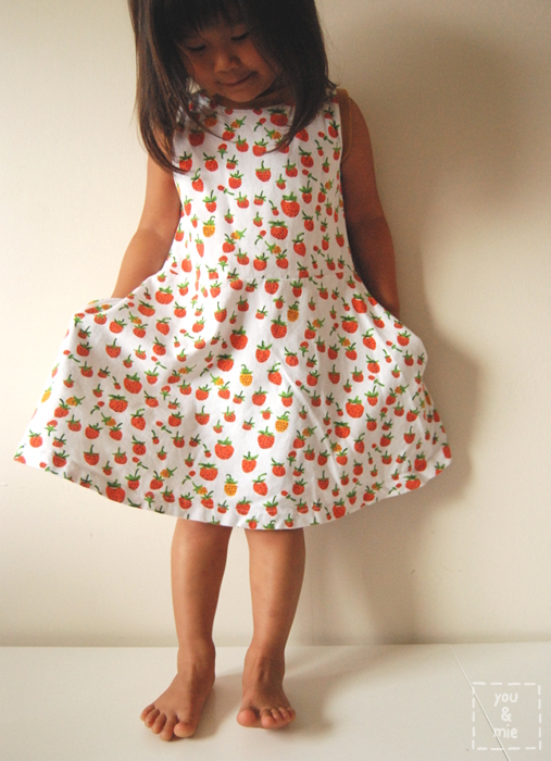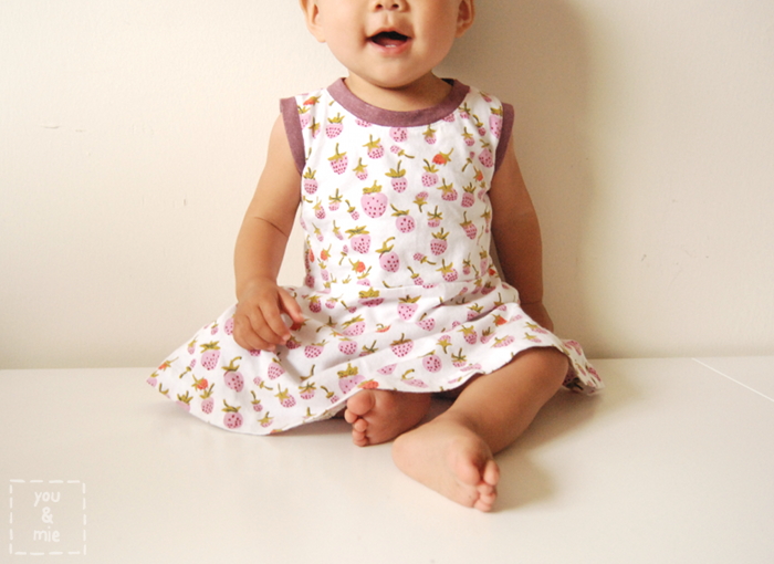 Strawberry Skater Dresses by you & mieOh and I couldn’t forget little sister, could I?  So Kaya got a little mini Skater dress!  I used the FREE Little Skater Dress pattern that is available on the Kitschy Coo blog for sizes 6-12m and 12-18m. (though you’ll need the original Skater Dress pattern if you want the directions).  I used the smaller size, but modified it to be even more mini since Kaya is so petite.  I also redrew the armholes since the pattern is meant to have sleeves and I was making a sleeveless version.
