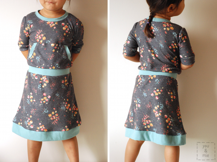 I made this dress in size 2 based on Yuki’s chest measurement and it fits perfectly.  I probably should have gone a size up to make it last longer, but it’ll at least last this season.  I was worried a little bit about length, and also feeling too lazy to hem the dress, so I added a band at the bottom instead.  While I think the added length is good, I don’t really love how it came out.  The aqua fabric I used here is a french terry that is thick and cozy, but a little too thick for this.  Folded in half as a band basically created a hoop at the bottom of the skirt, so the shape looks a little funky.
