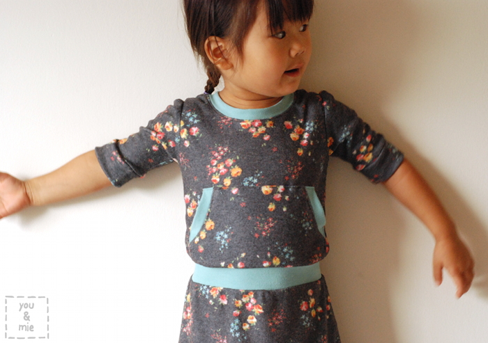 Awhile back, Toni of Make it Perfect contacted me and asked if I wanted to try out one of her new patterns, the Joey dress for girls.  I dunno if you’ve noticed, but Yuki is aaaaall about the knit dresses so I was excited to add another knit dress pattern to my collection – and this one is so cute!  I love that kangaroo pocket and the different sleeve lengths, making this pattern great for all seasons.