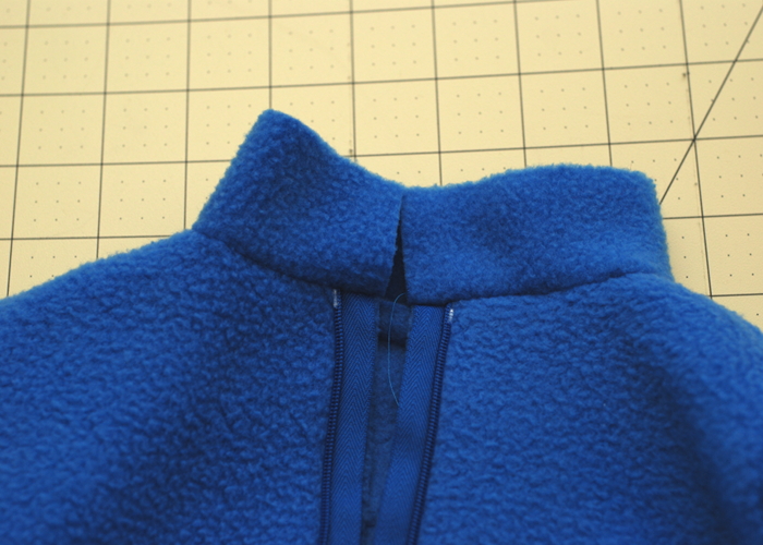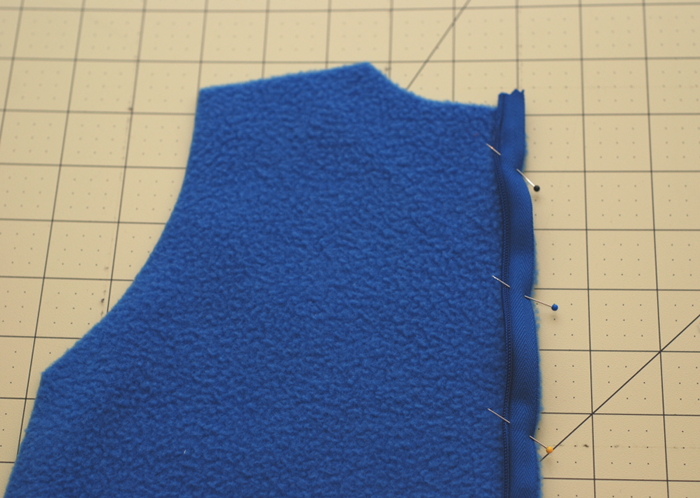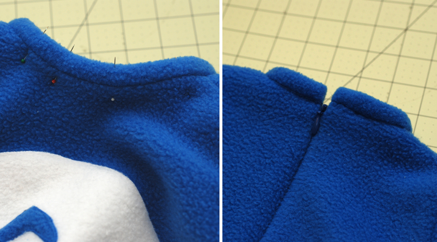 Now it’s time to attach the invisible zipper.  I won’t go into great details here on how to do this, but you can check out this great tutorial (with video) on how to install an invisible zipper.  Honestly, I skipped some steps since this is just a costume and it’s fleece and I didn’t think it needed to be perfect.  I didn’t iron the zipper and I don’t have an invisible zipper foot, but it still turned out just fine.