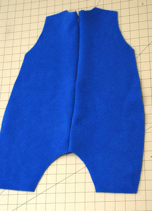 Fold the back along the zipper (I had flipped my back piece around here, so the you’re looking at the leg hole up at the top).  Finish sewing the center seam together with a 1/2″ seam allowance (white line).  Be sure to sew beyond the end of the zipper and on the inside of the zipper.  Reinforce this end by backstitching several times.