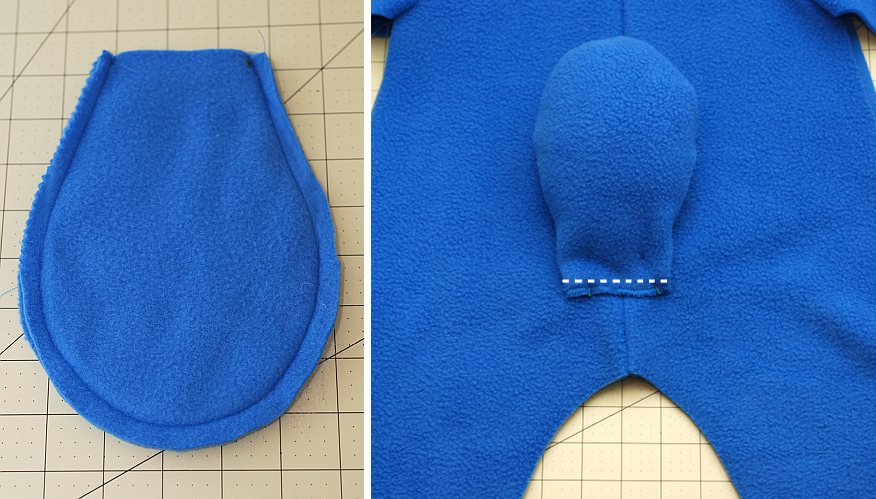 For the tail, cut two pieces in whatever shape you want.  Place them right sides together and sew the curved edges together leaving the flat/top edge open.  Flip it right side out and stuff it.  Close the tail with a zig zag stitch or serger.  Place the tail pointed up on the right side of the back bodysuit piece just below the bottom of the zipper.  Sew along the dotted line to attach the tail and be sure to back stitch a bunch at each end to make sure that sucker doesn’t get pulled off!