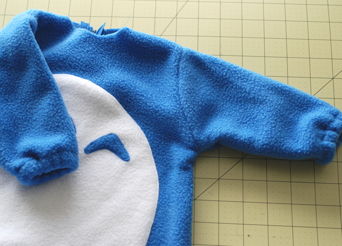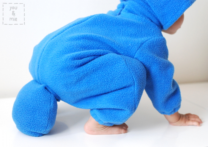 The costume is two pieces, the body suit and a separate hood.  The original costume had snaps along the inside leg for easy diaper changes, but I omitted that this time around because it just didn’t seem necessary for a costume (and I was lazy).