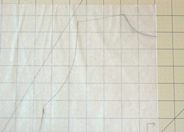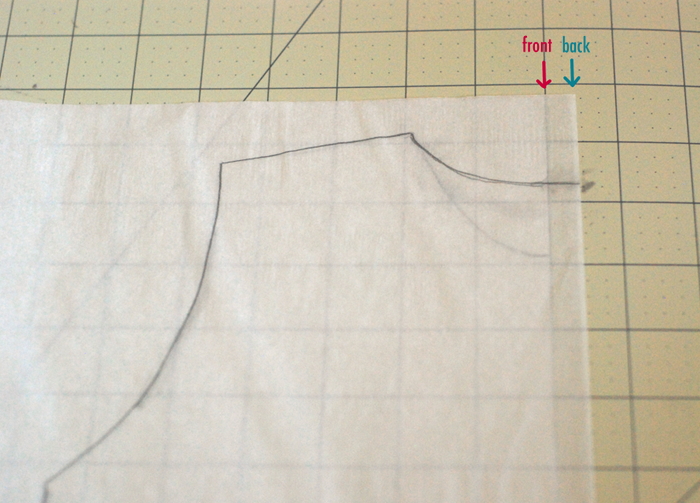 Now we’ll make the pattern for the back piece.  Place another sheet of tracing paper on top of your front piece, but have the edge extend a 1/2 inch past the edge of the front pattern piece.