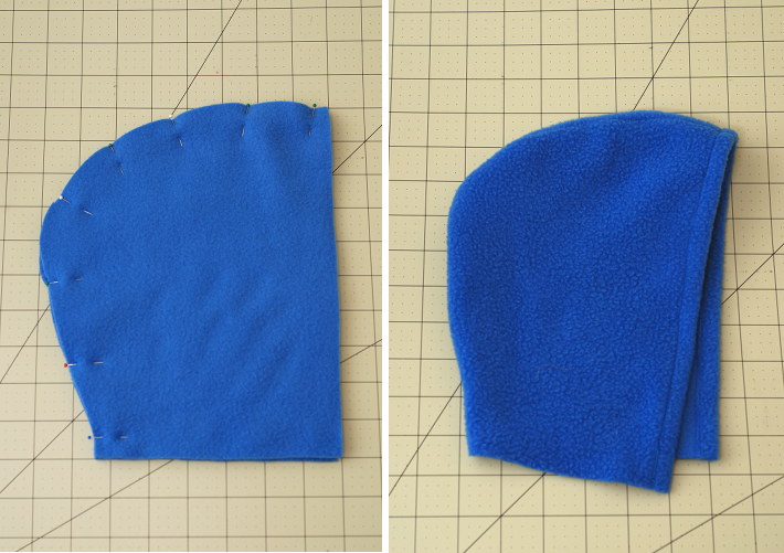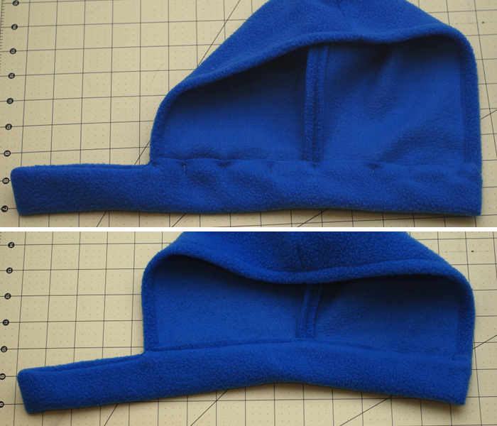 Pin the rest of the band up on the inside of the hood and on the outside of the hood, stitch in the seam (make sure you’re catching the inside of the band in your stitching.  Trim any excess fabric.