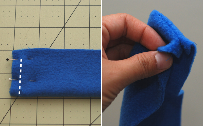 At the other end, fold the band right sides together and sew from the edge of the hood around the corner of the band.  Clip the corner and then turn right side out.