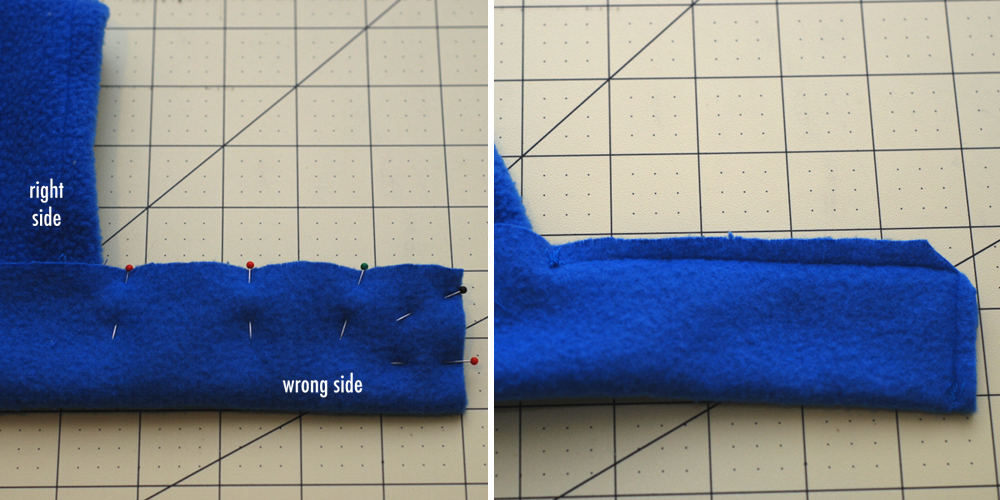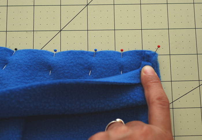 Pin along the neckline and stitch in the ditch to sew the binding down on the inside.  Fleece is too thick to fold the raw edge in on the inside, but it looks and feels just fine.  Trim down the extra fabric on the inside close to the stitch line.