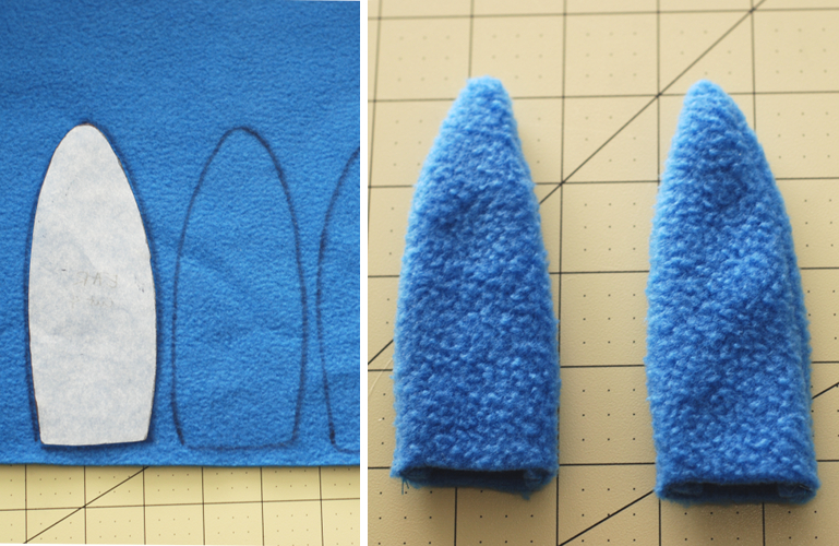 Draw and cut out 4 ear pieces.  Place two, right sides together, and sew along edges, leaving the bottom open.  Flip right side out.