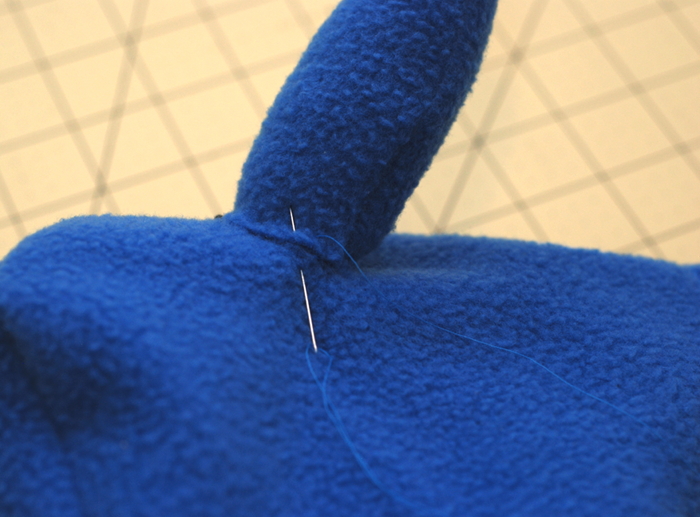 Stuff with stuffing.  A lot of people ask how I get the ears to stand up, so this part is important.  It’s very simple though!  You want to sew the ears on as a circle.  If you try to close the bottom by sewing the two sides together into a straight line, or if you sew the ear on by sandwiching it in a seam, it’ll just flop down.  Figure out your ear placement and pin the ear down in place making sure the bottom of the ear is open and in a circular (or oval) shape.