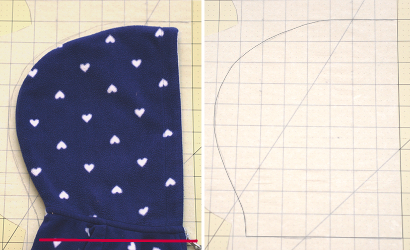 To make the hood pattern, grab a hooded sweatshirt or jacket and place it on top of your tracing paper.  Leave a 1/2″ of space between the edge of the paper and the edge of your hood.  Trace along the curved edge with a 1cm seam allowance.  Draw a straight line 1 cm below the bottom edge of the hood at the front of the jacket.