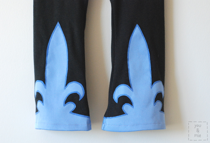 The pants were made using the leggings pattern, but I flared out the bottoms to look more like yoga pants.  I appliqued the “cutie mark” (cloud/moon symbol on her rear) and the “armor” before assembling the pants.  Both the shirt and pants are size 3T and they fit her pretty perfectly.