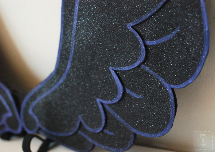 Next up were the wings.  I used this tutorial for basic construction of the wings, altering it for my needs.  I used 4 large sheets of craft foam and each wing is 4 layers.  Looking at the image of Nightmare Moon, I drew two wing shapes that were meant to be overlapped.  I cut them out with an X-acto knife, then used a purple paint pen to draw the outline and details.  After gluing it all together, I used Krylon Glitter Shimmer in Moon Beam Black and IT WORKED PERFECTLY.  Just how I imagined.  Which is more than I can say for the fabric glitter spray.  I kinda think the wings are my favorite part of this outfit.