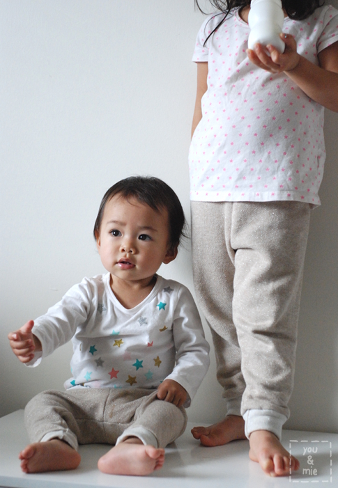 But after I cut out my own pants from the fabric, I realized I had enough to make little sweatpants for both of my girls!  I couldn’t resist.