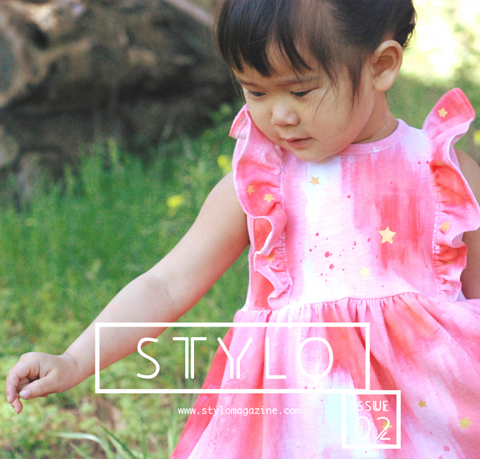 I was absolutely honored to be asked to be a part of Stylo Magazine‘s second issue. I meant to write a separate post about the outfits I made my girls for the magazine, but I never got around to it! But you should check out the entire issue, which includes my spread (starting on page 95) and a ton of others from really amazing and inspiring makers and seamstresses. I started with plain white cotton (knit and woven) and hand painted them to create one-of-a-kind fabrics before making them into outfits for my daughters.