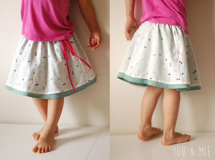 The skirt comes together quickly which is why I tackled this project before the Swingset Tunic which is also on my to do list this week, I was trying to ease into it with something simple. I made size 3 for Yuki based on her measurements and I think the fit is perfect, plus it’s got an elastic waist, so it’s pretty flexible. She loves it and already tried to wear it two days in a row, so that’s great. It’s the pink bow that’s got her hooked.