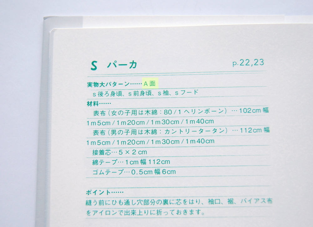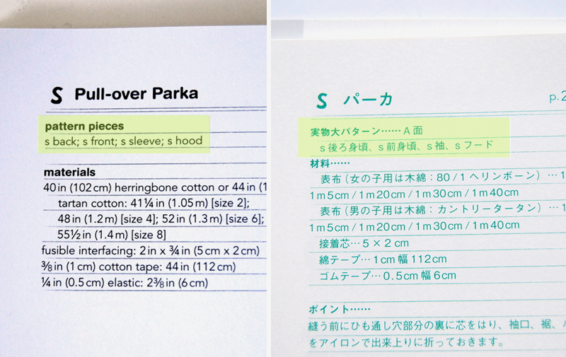 On the directions page for the pull-over parka, it’ll list all the pattern pieces you’ll need. For this pattern there is the back, front, sleeve and hood and the pattern label is “s.” That letter is going to help us locate everything we need for this pattern. First I’m going to go through all the steps using the English version of the book since I think that’s what most people are using. But if you’re using the Japanese version of the book, I’ll help you locate the pattern for that book at the end of this post.