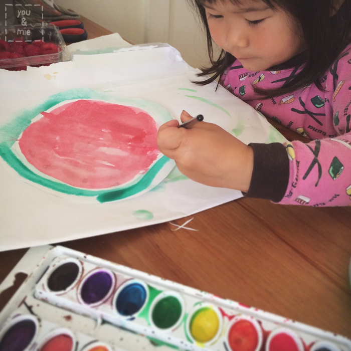 I started a Watermelon Party Pinterest board to collect my ideas, but the project we started with first was the invites, of course! I think I was inspired by these party favor holders, but I basically thought it would be fun to get Yuki involved by painting some watermelon invites!
