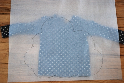 First, use a shirt to draw out a cloud pattern. You’ll want the sides of the cloud to extend past the edges of the shirt (we’ll connect them later), but the pattern shouldn’t go past the shoulder to restrict arm movement. Add seam allowance.