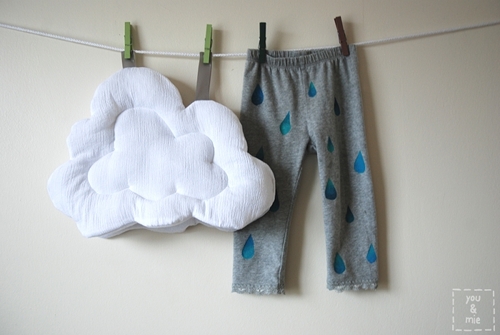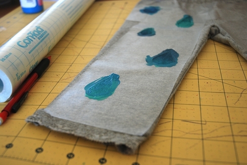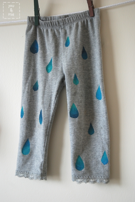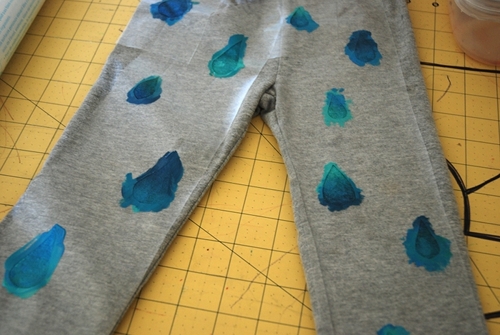 The part of this project that took the longest was waiting for the fabric paint to dry on the pants, so I would start there. Make rain drop stencils from the contact paper and stick them to your pants. Use fabric paint to fill in your stencils (be sure to read and follow all the directions on the paint that you use). I made 3 shades of blue and used two for each rain drop for a kinda gradient/ombre look.