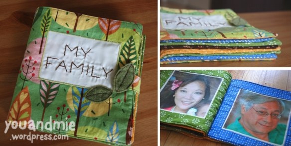 The first book I made was with iron on transfers. I’d used these several times before to make t-shirts and they seemed to hold up pretty well in the wash (a very important test for anything that will be around babies). I chose photos of all of Yuki’s family members. I printed them as 5×5 squares and ironed them onto white cotton.