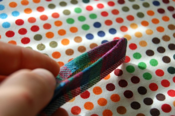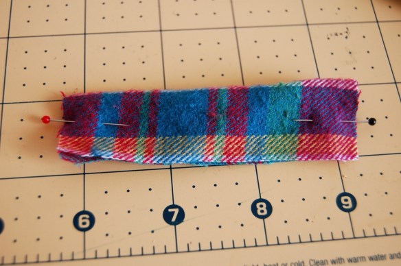 To prepare your straps, fold them in half lengthwise (right sides together) and press. Then sew along the long edge and one of the short edges with a 1/4 inch seam allowance. Be sure to leave one short edge open. Trim the corner.