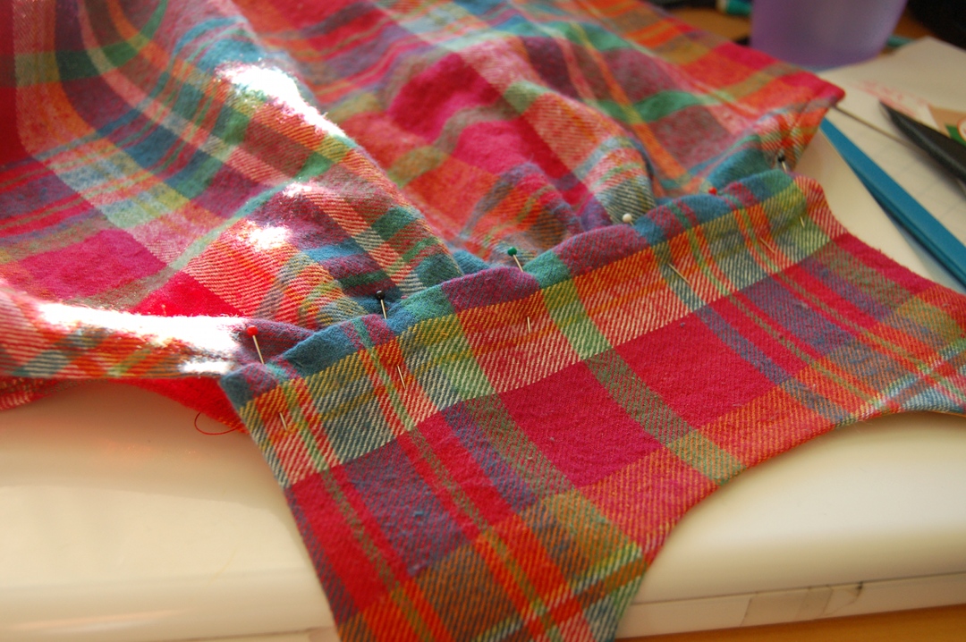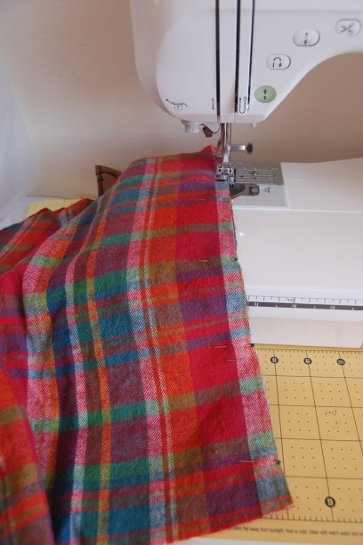Place the skirt front and back pieces together (right sides facing in) and pin along the side edges of the skirt. Sew together using a 1/2 an inch SA, trim and finish edges using a serger or zig zag stitch.