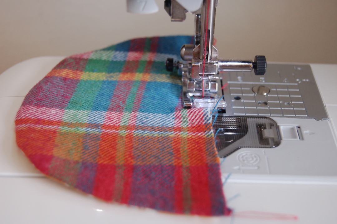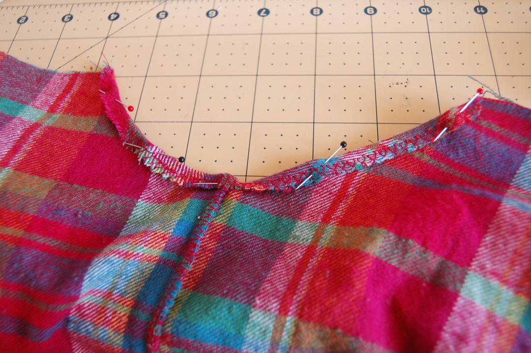 Place your collar pieces wrong sides together and pin along the bottom (notched) edge. It may help to mark the line you want to sew along, for the notched portion, to assure you get a nice even and centered notch. Sew just along the bottom edge of the collar.