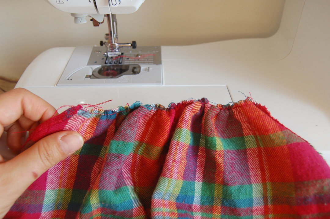 Gather the skirt front piece by sewing two basting lines along the top edge of the skirt. To baste, set your machine on the longest stitch and do not backstitch at the beginning or end. Leave the threads long and pull carefully to gather the skirt. You want the width to be 1/2 an inch longer than the bodice on each side. Leave that 1/2 inch ungathered.