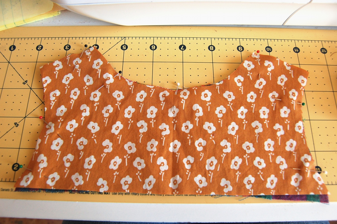 Pin the bottom edge of the bodice to the top edge of the front skirt piece with right sides together. There should be 1/2 an inch of ungathered skirt sticking out on either side of the bodice.