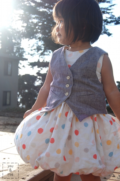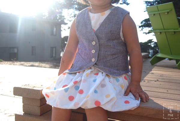 You’ll also need to cut 2 rectangles for the skirt front and skirt back from your main fabric. I used one of Yuki’s dresses to determine how wide to cut the rectangle (by measuring the width of the bottom of the skirt then adding 1 inch for seam allowance) and the length will depend on how long you want the skirt to be, plus added length for seam allowance and hemming. For the skirt back piece, add one inch to the length to create casing for the elastic. My skirt pieces were 27×14 inches for the front and 27×15 inches for the back.