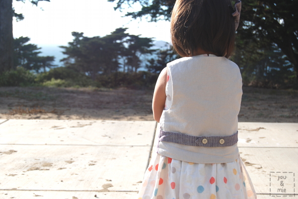 We’re almost done! Just a few more finishing touches. On the inside of your back skirt piece, hand sew two buttons to attach the straps to.