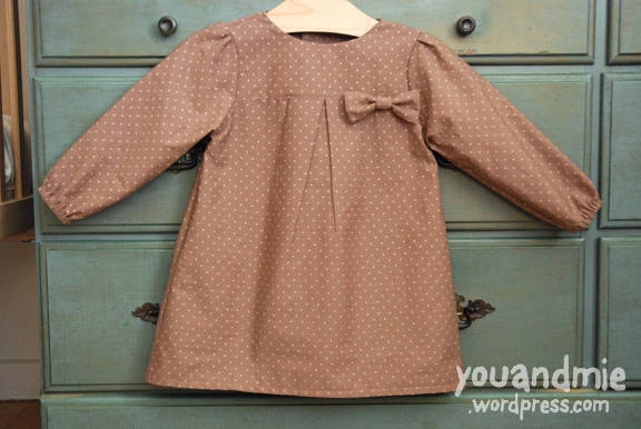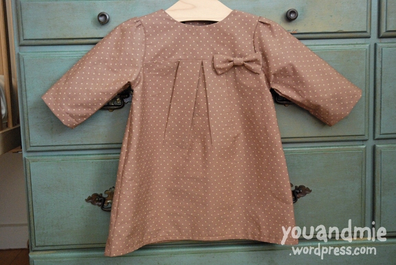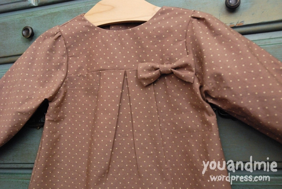 For Kaya, I went with the always adorable Geranium Dress pattern in size 0-3 months. I used Confetti Sparkle in Cream for the skirt and some leftover shirting from the lining of my wedding dress for the bodice. I used the same Berry piping around the waistline as Yuki’s dress, but it looks dark brown or maroon in these pictures.
