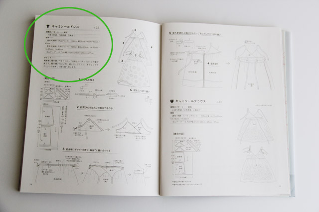 Materials/Supplies – This is where fabric and notions information will be listed. The quirky thing about Japanese sewing books is that they don’t really offer recommendations for fabric options. They list the exact fabric that was used for the garment featured. So instead of a list of fabric recommendations as you would see with American or European patterns, this section will list “Liberty Tana Lawn” or “Striped yarn-died cotton”. It’s interesting to see what they used, but I usually completely ignore the fabric section. Rather than spending time trying to painstakingly translate every part of the fabric listed, I would merely try to see if one of the common fabric types was used (I talk about links to a dictionary of sewing terms in the next section).
