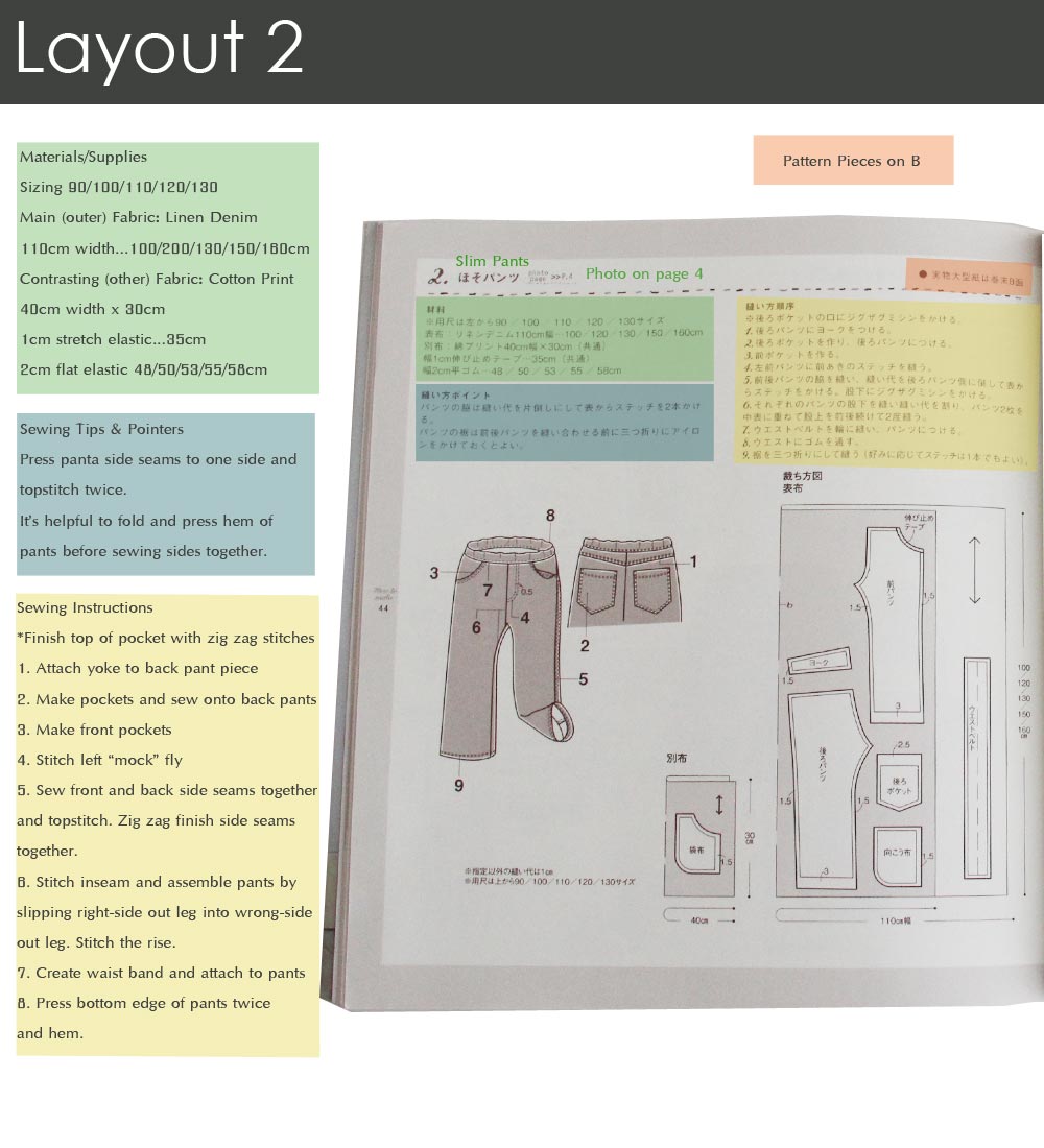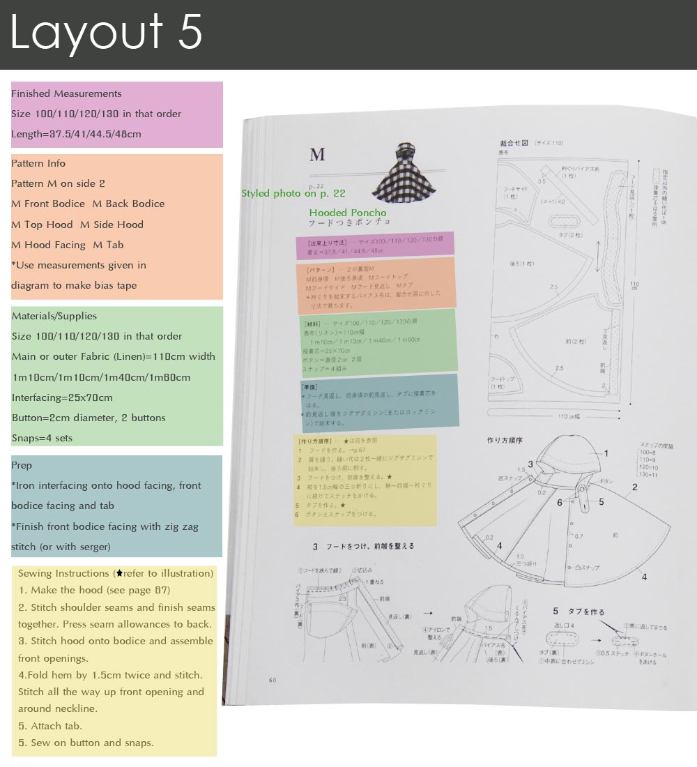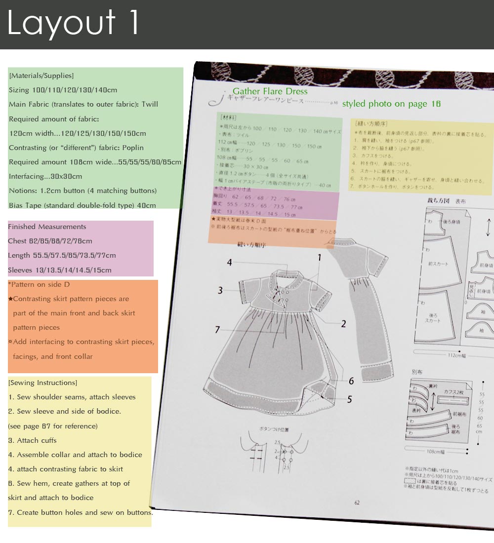 I own fourteen Japanese sewing books, and the books all have some variations of the information listed above in the instructions section at the back of the book. I’ve color-coded sections you’ll most often see. Here are a few more details about each section: